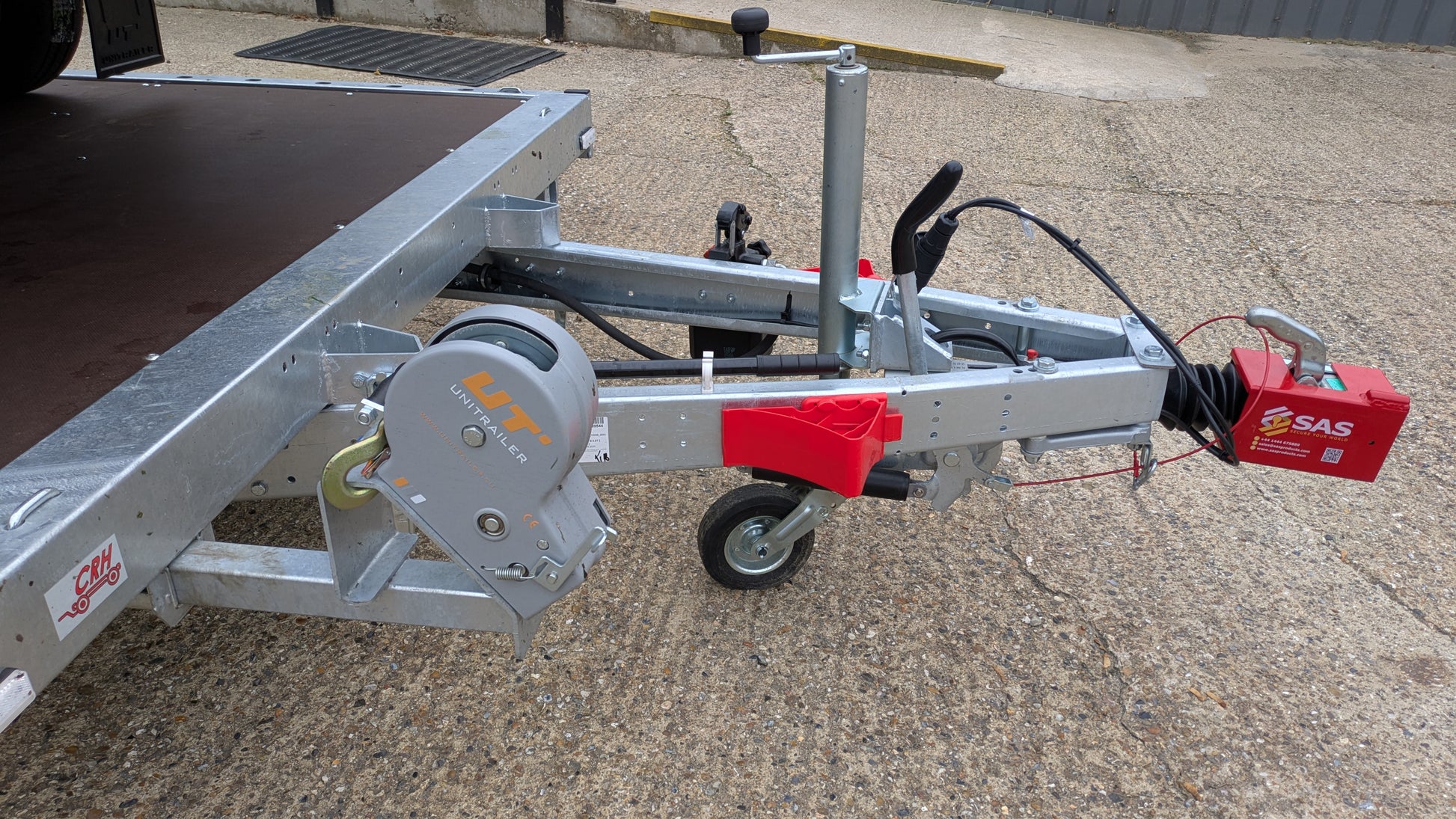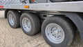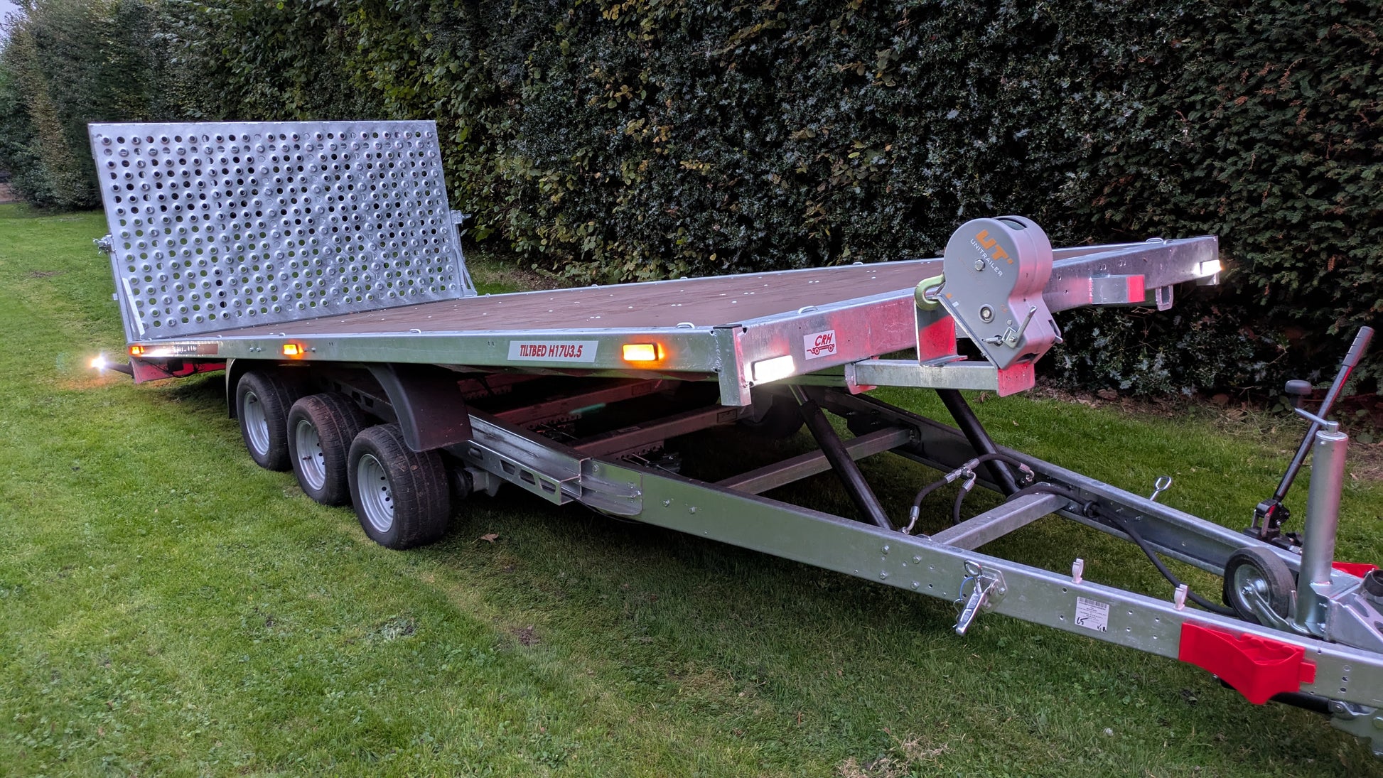 The CRH Heavy Braked Tilt-Bed Trailer is a high-quality PRO tilt-bed trailer, measuring 16'8" x 6'10" with a tailgate ramp. This tri-axle trailer has a low loading angle of 9 degrees, making it ideal for heavy-duty hauling and easy loading. Perfect for a variety of uses, this trailer comes with a robust construction and features a fully welded frame.