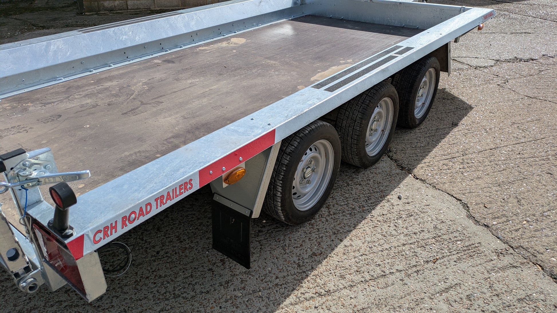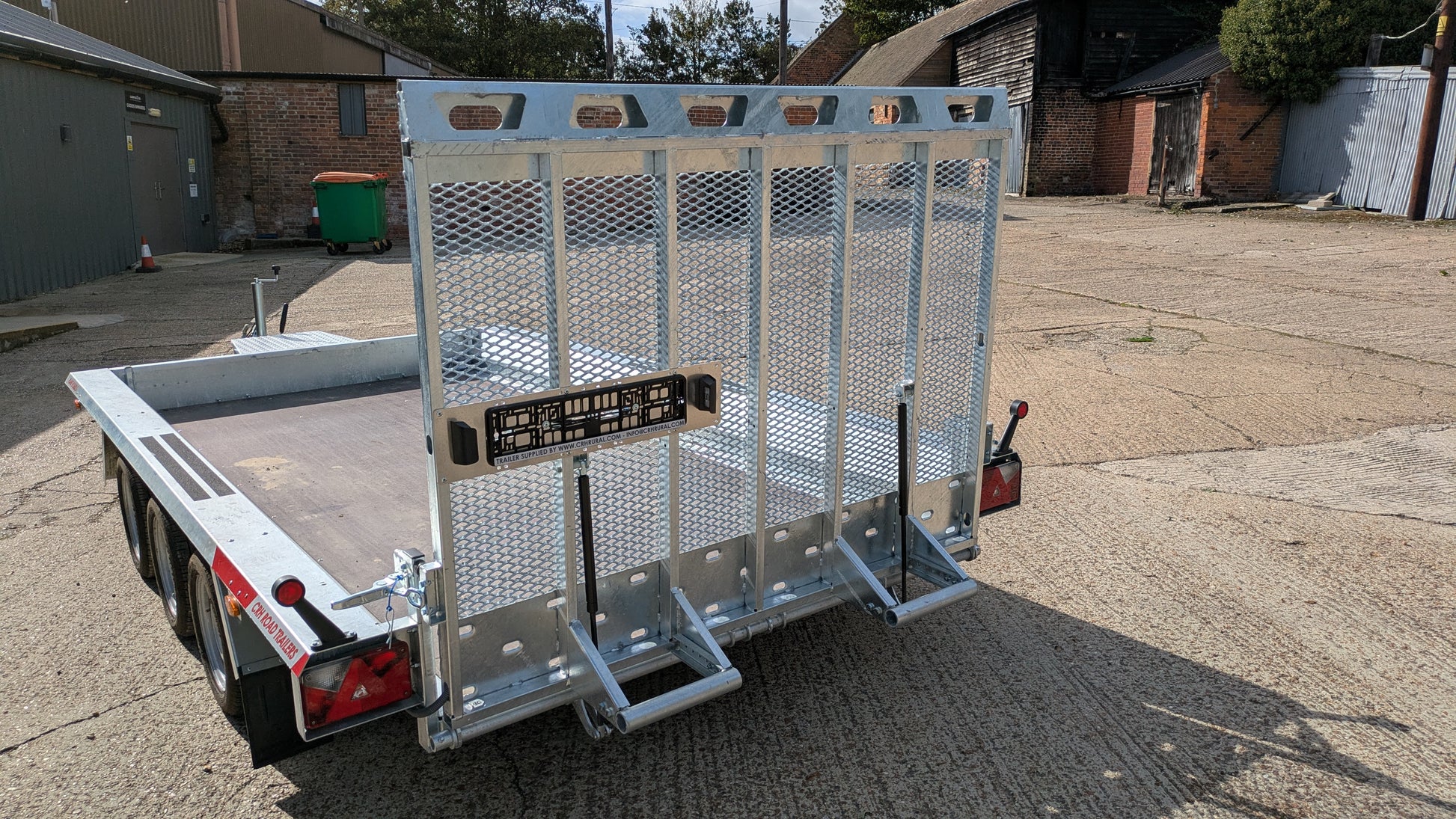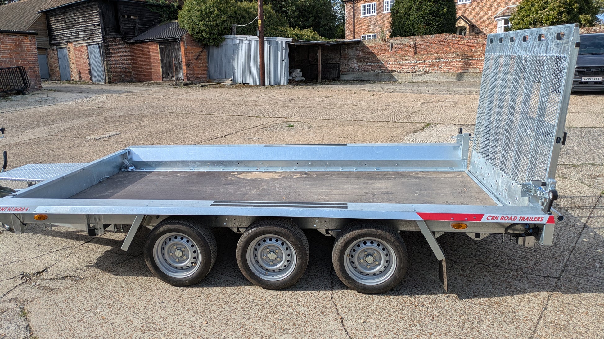 The CRH Heavy Braked XL Plant Trailer is a PRO XL Plant Trailer, offering an impressive 13'2" x 6' bed with a high payload capacity. Equipped with an HD tailgate ramp, this tri-axle trailer is the largest plant trailer we know of, designed for heavy-duty and plant transport. The trailer is equipped with a strong integral chassis frame that can even be walked on.