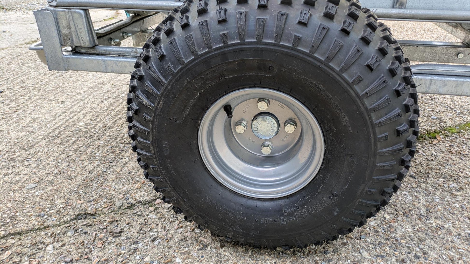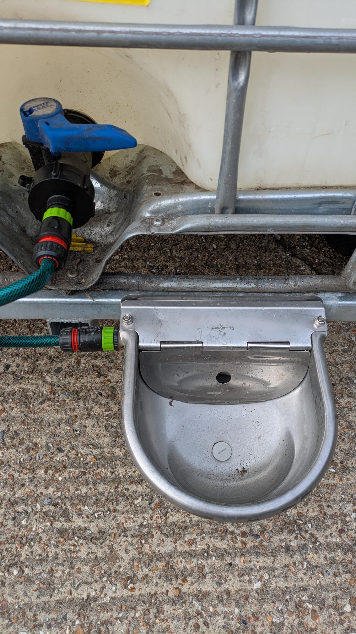 Our 'off-road' IBC tank in frame (IBC used once and steam cleaned for use as an animal waterer) mounted to a fully welded and HD galvanised chassis for long outdoor life.