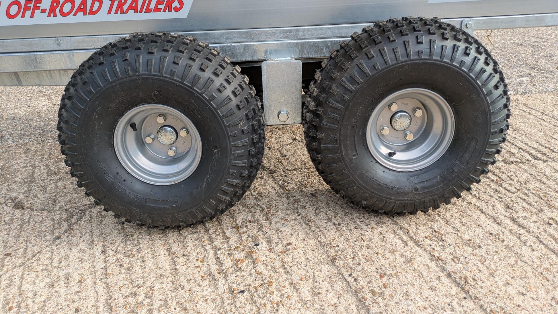 Walking twin axle - ideal for undulating ground with genuine Knott stub axles and off-road knobbly low-impact flotation tyres fitted.