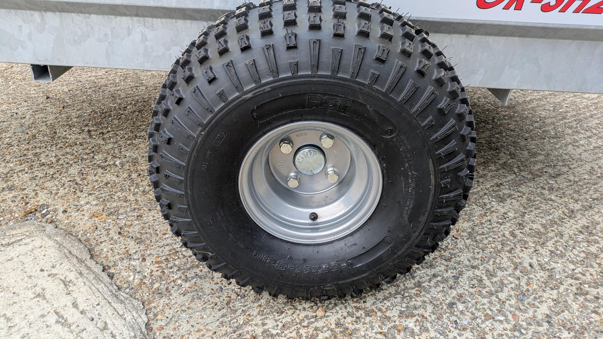 Single Knott axle and off-road knobbly low-impact flotation tyres fitted.