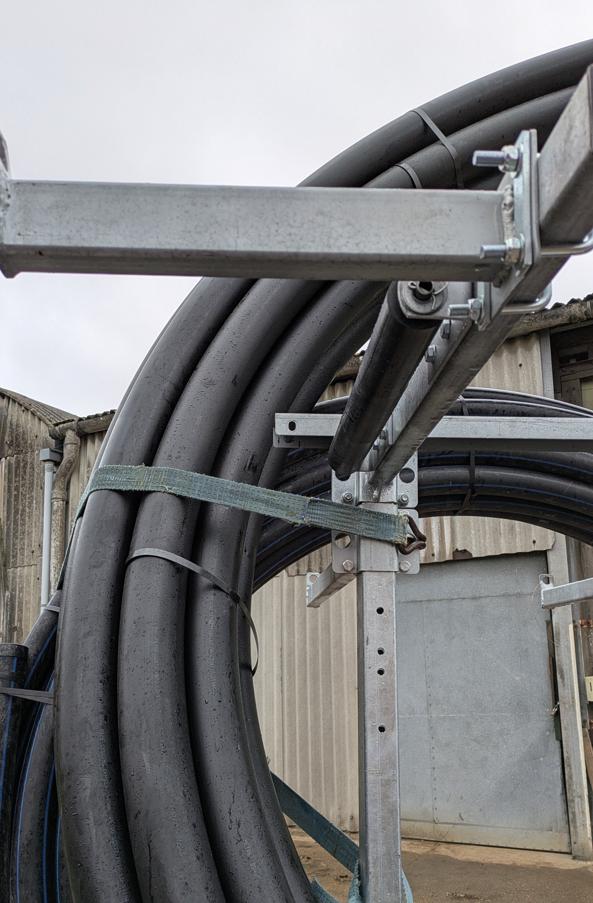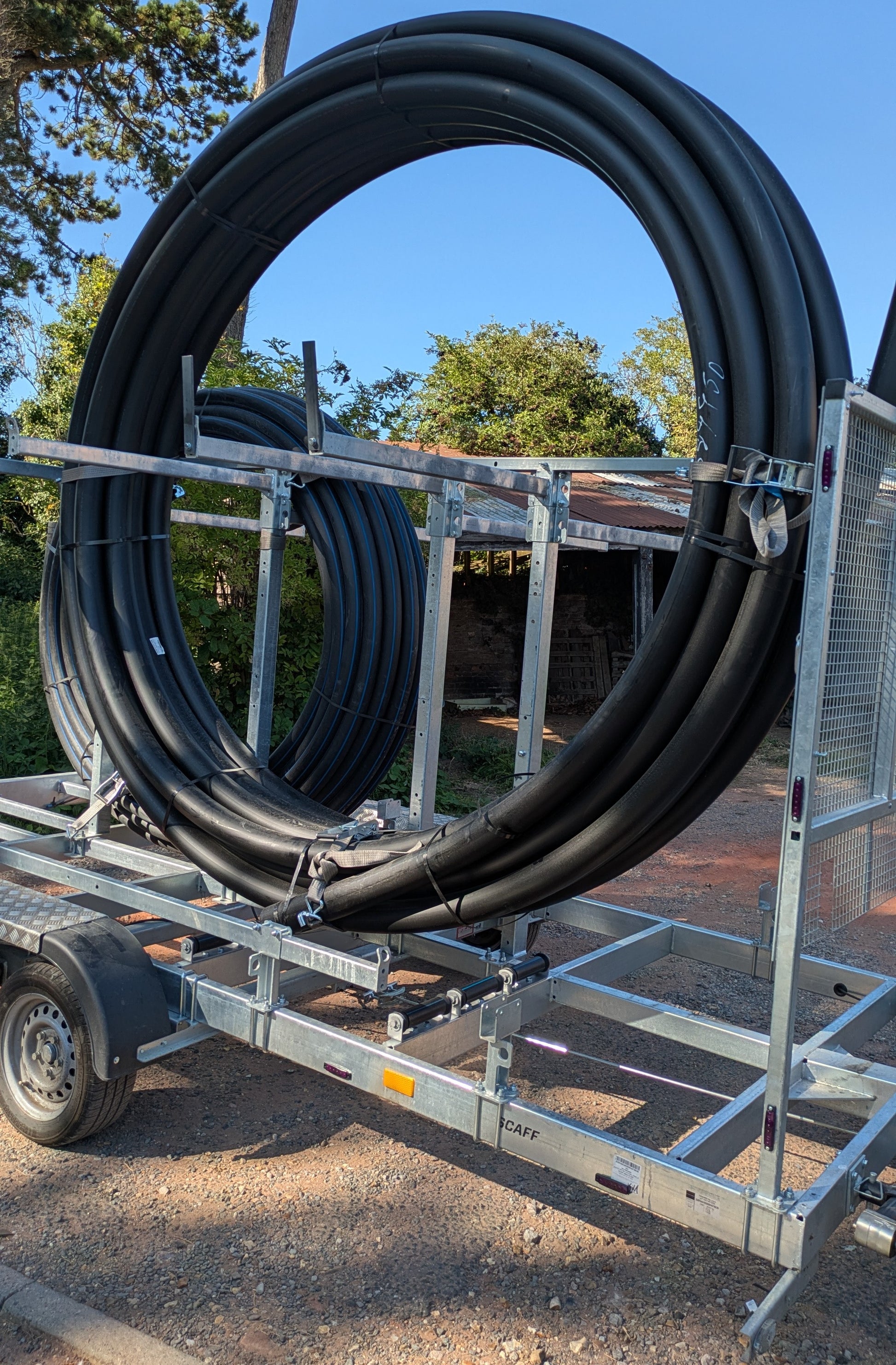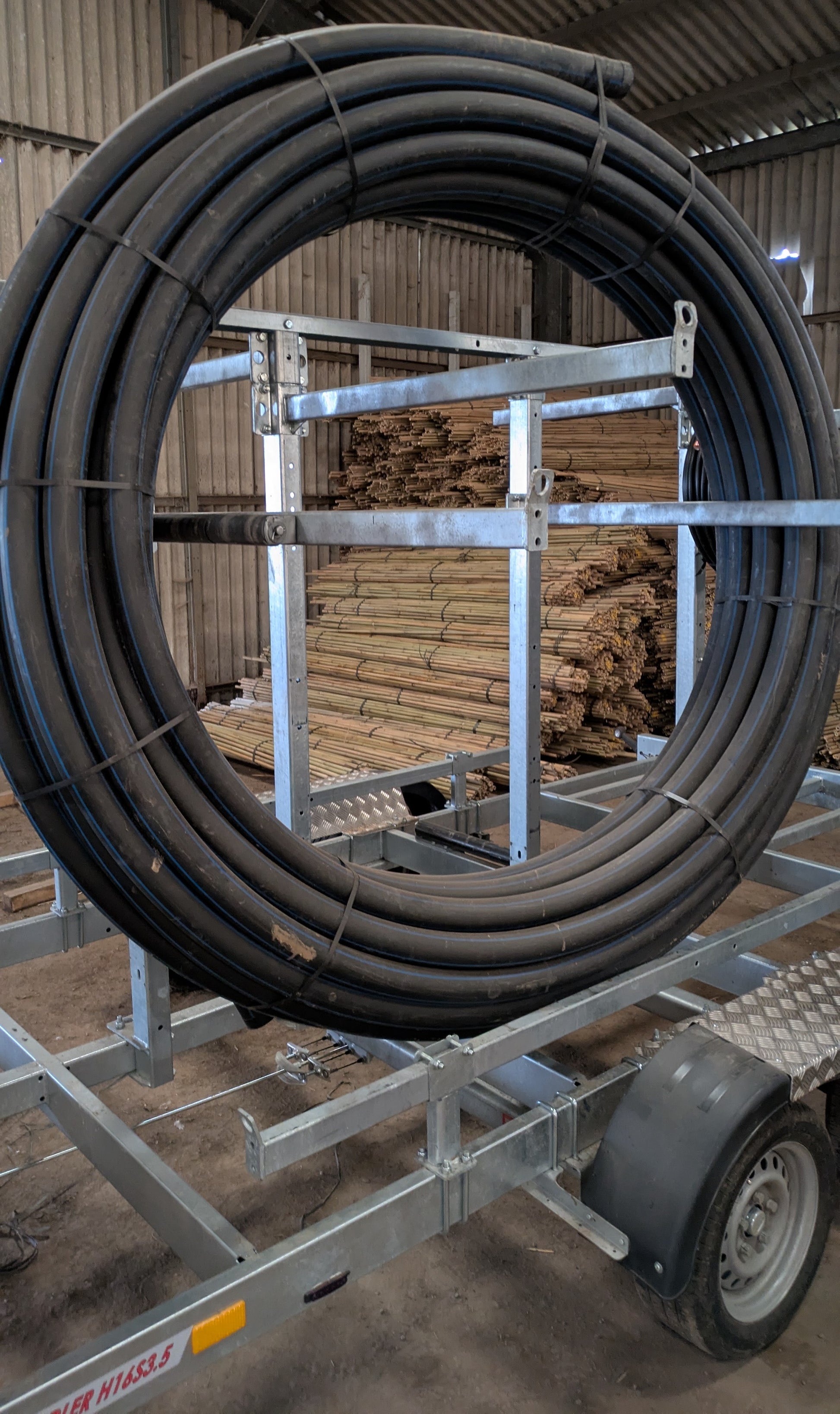 An open chassis trailer with a centre frame designed for carrying and unreeling pipe coils up to 110mm x 100mtr, making it ideal for the pipe handling industry.