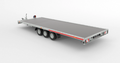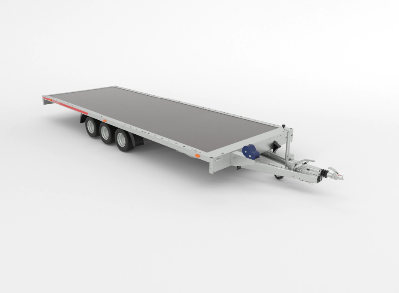 Extra-large flat platform trailer, designed for transporting larger loads, with a tri-axle setup and 3.5t capacity.