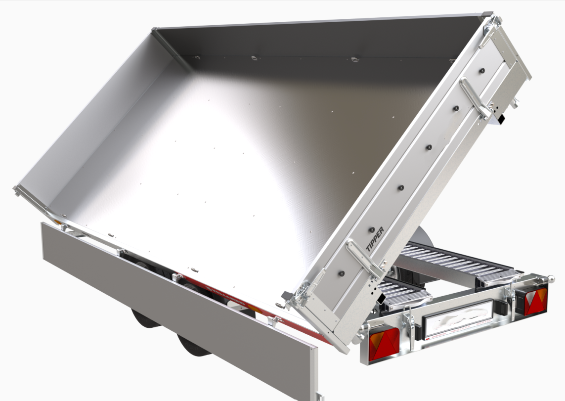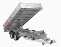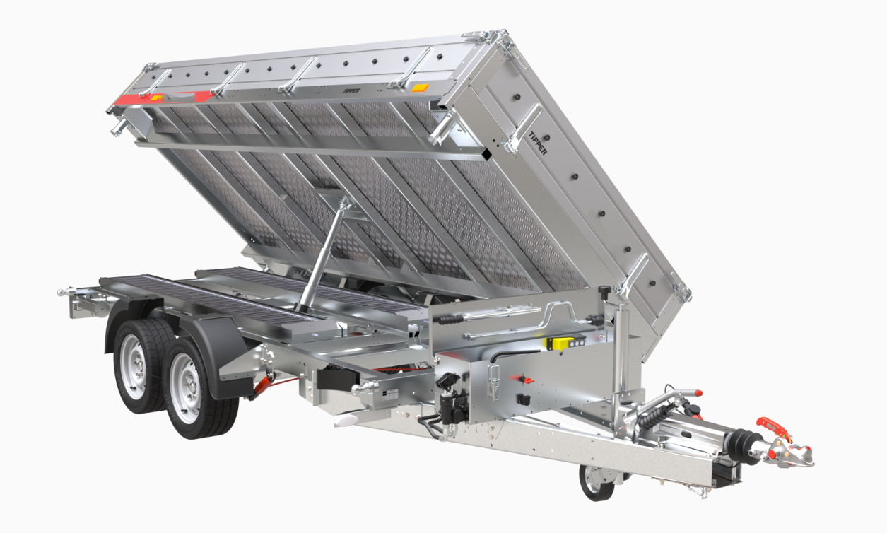 A large 3-way tipper trailer with a 3.5t capacity, equipped with side and rear tipping functionalities.